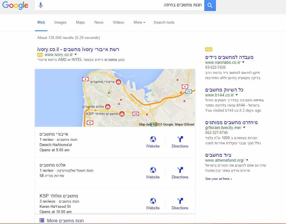 בשנים האחרונות גוגל התחילה לממשק את הרישום של העסקים במפות שלה עם תוצאות החיפוש האורגניות בגוגל, כך שבחלק מהחיפושים שמזכירים את שם הישוב או האזור – בחלק העליון של התוצאות מופיע קטע רלוונטי מהמפה עם סימון העסקים עליו וגם שמות של מספר עסקים עם כתובת, שעות פתיחה, קישור לאתר והוראות הגעה. תראו איזה יופי של תוצאה מתקבלת כאשר מקלידים בחיפוש בגוגל “חנות מחשבים בחיפה”: